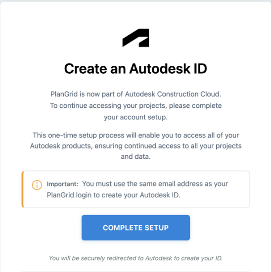 Creating an Autodesk ID only takes a few steps. To do so, please log in to PlanGrid account and click the complete setup to create your Autodesk ID. After you have created an Autodesk ID, you will use these credentials to log into PlanGrid and continue to access your projects uninterrupted.