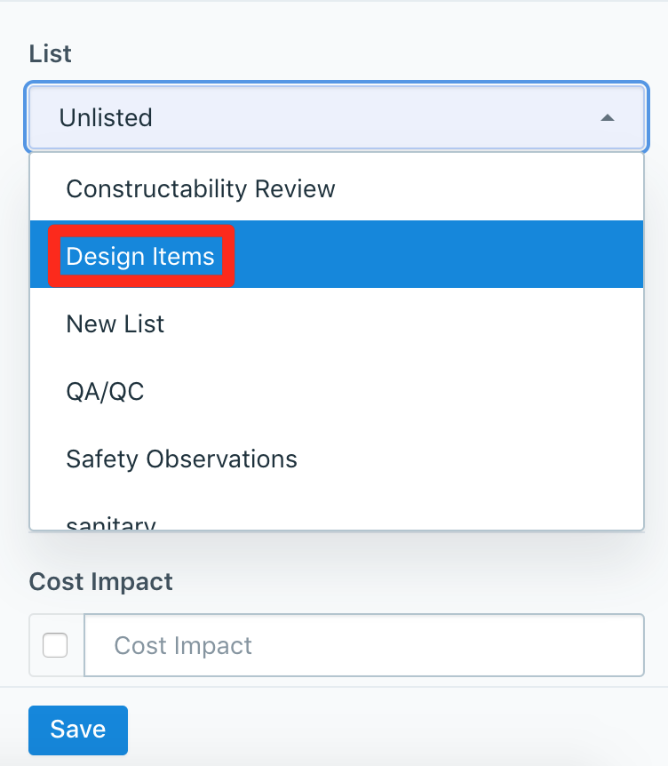 2. [リスト]の下のフィールドをクリックし、ドロップダウン メニューからリストを選択します。